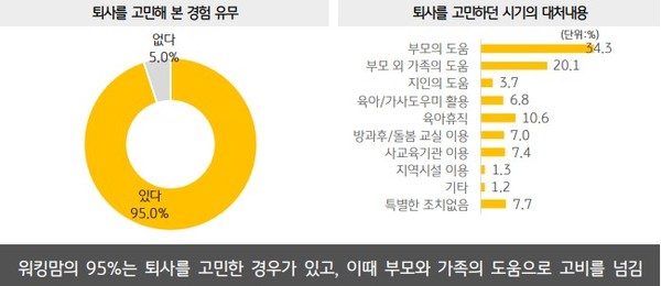 또 워킹맘의 95%가 직장생활을 하면서 퇴사를 고민해 본 경험이 있는 것으로 나타났다. 퇴사를 고민했던 주된 이유는 자녀가 아프거나 자녀케어가 어려울 때와 같은 ‘자녀관련 이슈’와 직장에서 불이익을 받거나 업무가 과중할 때와 같은 ‘직장관련 이슈’였다.
