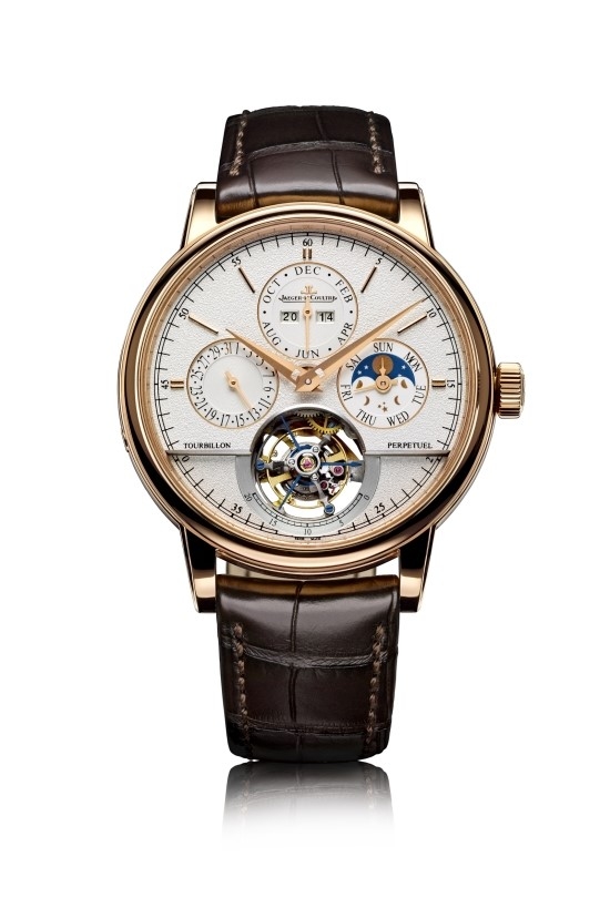 19세기 후반 예거 르쿨트르 매뉴팩쳐에서 생산한 포켓 워치에서 영감을 얻은 ‘마스터 그랑 트래디션 투르비옹 실린더릭 퀀템 퍼페추얼’은 지름 42mm, 두께 13.1mm 사이즈의 케이스는 핑크 골드 소재로 제작되어 있다. 그레인 처리된 클래식한 실버 다이얼 위에는 전통적인 디자인의 슬림한 미닛 서클과 막대 형태의 아워 마커, 날짜를 표시하는 9시 방향의 서브 다이얼, 월과 연도를 표시하는 12시 방향의 서브 다이얼, 그리고 문페이즈의 원주를 따라 요일을 표시하는 3시 방향의 서브 다이얼 등 퍼페추얼 캘린더의 인디케이터들은 투르비옹 상단에 조화롭고 가독성 높은 형태로 배치되어 있어 아름답게 균형 잡힌 우아한 외관을 보여준다.