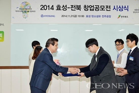 이날 시상식에 참가한 효성 이상운 부회장은 장래 전라북도 창조경제 구현에 기여할 수상자들을 치하하고 팀 별로 상장과 창업 장려금 각 1,000만원을 전달했다.