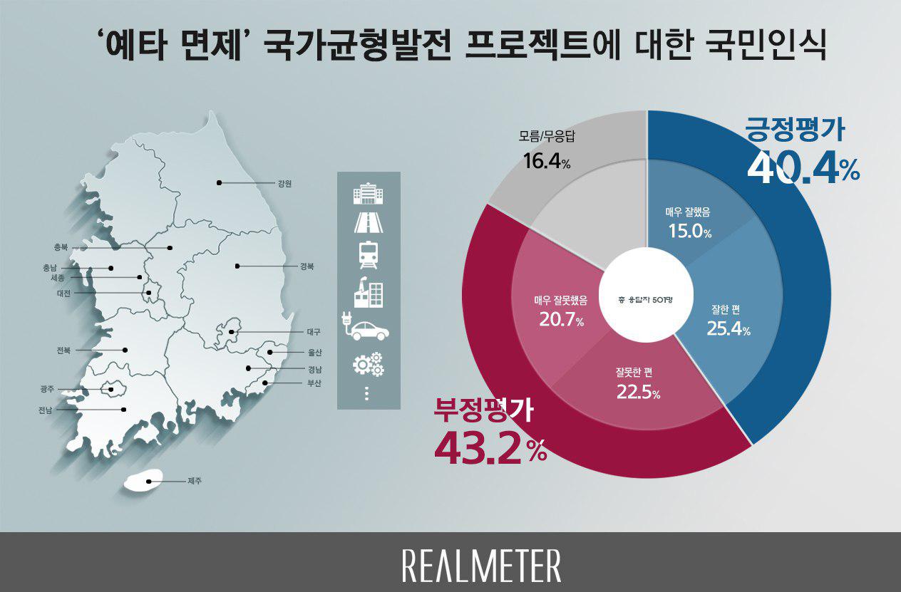 여론조사 전문기관 리얼미터(대표 이택수)는 정부의 국가균형발전 프로젝트 추진 결정에 대한 국민인식을 조사한 결과, 부정평가(매우 잘못했음 20.7%, 잘못한 편 22.5%)는 43.2%로 긍정평가(매우 잘했음 15.0%, 잘한 편 25.4%) 40.4%보다 2.8% 앞선 것으로 조사됐다. ‘모름·무응답’은 16.4%.
