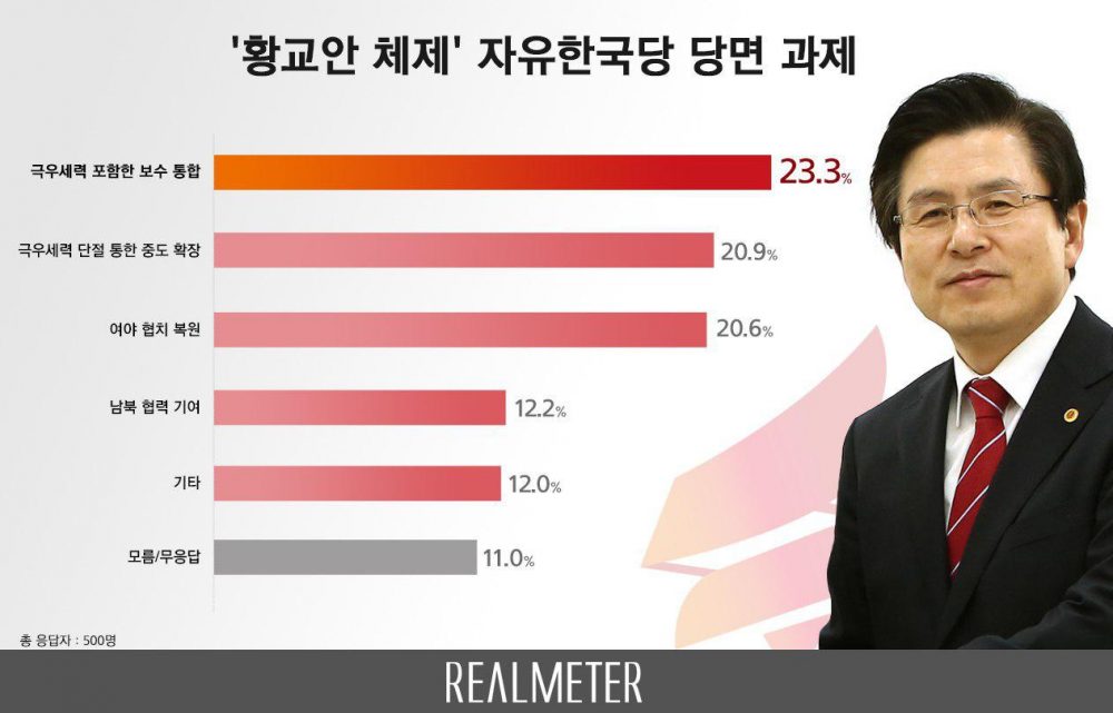 여론조사 전문기관 리얼미터(대표 이택수)가 자유한국당의 당면 과제에 대한 국민인식을 조사한 결과, ‘극우세력을 포함한 보수통합’이 23.3%, ‘극우세력과의 단절을 통한 중도확장’이 20.9%, ‘여야협치 복원’이 20.6%를 기록, 모두 20%대 초반의 응답으로 톱3 당면 과제로 조사됐다. ‘남북협력 기여’는 12.2%로 집계됐다. ‘기타’는 12.0%, ‘모름/무응답’은 11.0%.