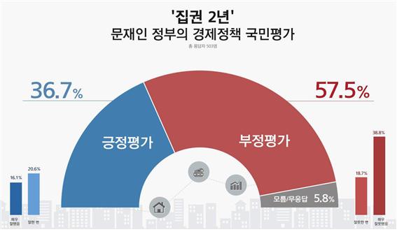 리얼미터가 지난 2년 동안 문재인 정부의 경제정책에 대한 국민평가를 실시한 결과, ‘잘못했다’는 부정평가가 57.5%(매우 잘못했음 38.8%, 잘못한 편 18.7%)로, ‘잘했다’(매우 잘했음 16.1%, 잘한 편 20.6%)는 긍정평가(36.7%)보다 크게 우세한 것으로 나타났다고 9일 발표했다. ‘모름/무응답’은 5.8%.