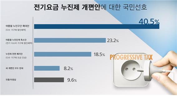 여론조사 전문기관 리얼미터가 전기요금 누진제 개편안에 대한 국민선호를 조사한 결과, ‘여름철에만 구간별 전력사용 허용량을 확대해 다수의 가구에 할인혜택을 주는 방안’인 ‘여름철 누진구간 확대안’ 응답이 40.5%로 가장 많은 것으로 집계됐다.