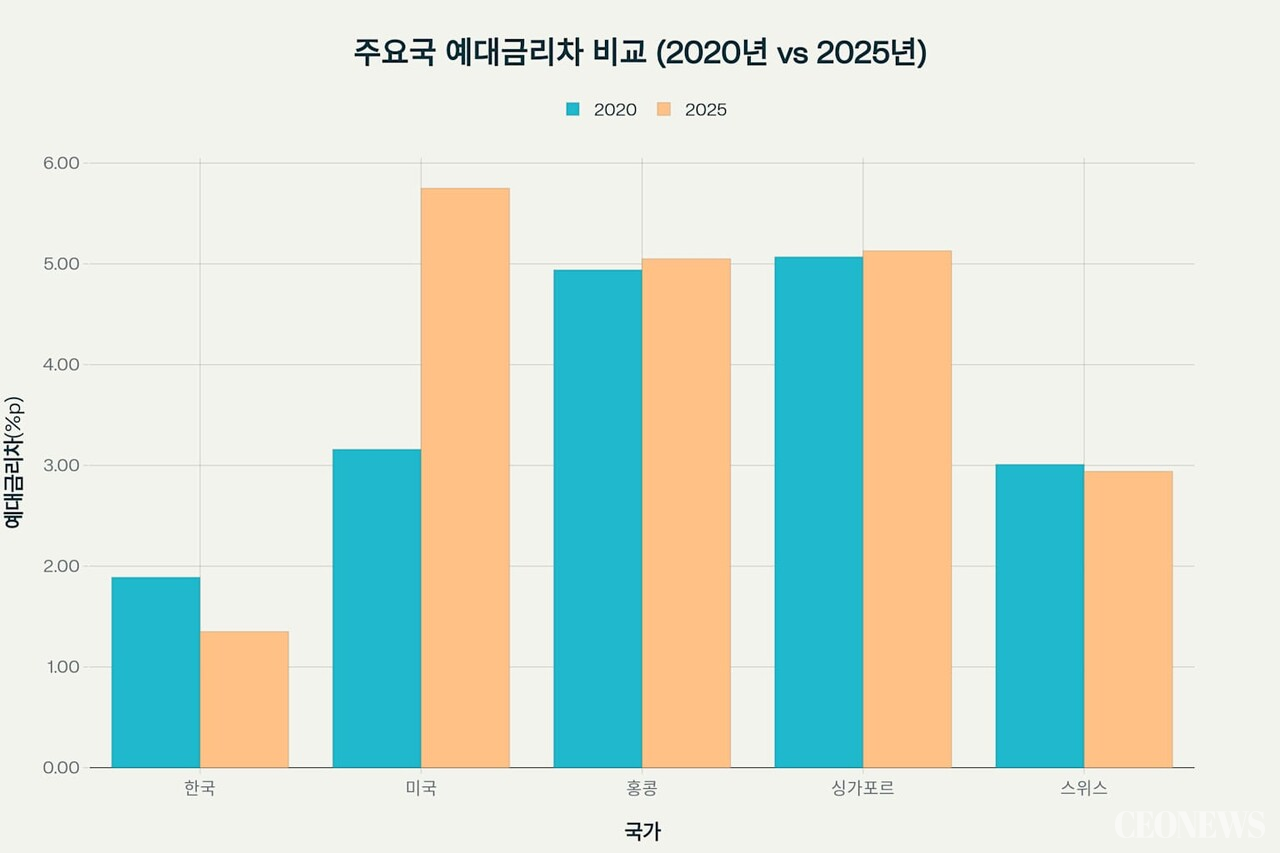 금융위원회와 한국은행의 공식 통계를 기준으로 분석한 결과, 한국의 예대금리차는 국제적으로 매우 양호한 수준을 보이고 있다. 2020년 말 기준 한국의 예대금리차는 1.89%포인트로, 같은 시기 미국(3.16%p), 스위스(3.01%p), 홍콩(4.94%p), 싱가포르(5.07%p)보다 현저히 낮았다