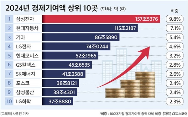 기업별로는 삼성전자의 지난해 경제기여액이 158조원으로 2023년에 이어 2년 연속 1위를 차지했다. 100대 기업 전체 경제기여액에서 삼성전자의 경제기여액이 차지하는 비중도 2023년 9.5%에서 2024년 9.8%로 0.3%p 상승했다.