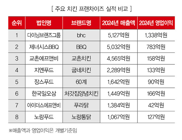 2025년 6월 현재 613개 치킨 프랜차이즈 브랜드 중에 지난해 연말 개별기준 매출액이 1천억원을 넘는 브랜드는 8개다. bhc가 5,127억원으로 1위를 달리고 있고, BBQ가 5,032억원으로 2위, 교촌치킨이 4,565억원으로 3위를 차지하고 있다.