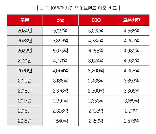 빅3 중에 지금은 bhc가 매출 1위지만 2021년까지는 교촌치킨이 1위였다. 교촌치킨은 2013년까지 1위였던 BBQ를 2014년부터 따돌리고 1위 자리에 올라선 이후 2021년까지 8년간 왕좌를 지키다가 2022년에 bhc에 1위 자리를 내어주고 2023년부터는 2위 자리도 BBQ에 빼앗긴 상태다. 빅3 브랜드의 1위 다툼 변곡점은 다음과 같다.