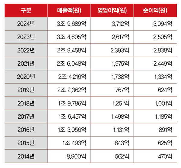영업이익 신장률은 더 가파르다. 2014년 562억 원이었던 영업이익은 2024년 3,712억 원으로 560.5%나 증가했다. 영업이익률은 2014년에는 6.3%였으나 2024년에는 9.4%로 수익성이 더 높아졌다.