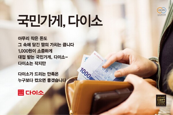 아무리 적은 돈도 그 속에 담긴 땀의 가치는 크다. 1,000원이 소중하게 대접 받는 국민가게 다이소, 다이소는 작지만 다이소가 제공하는 만족은 어느 기업보다 컸으면 좋겠다는 것이 다이소의 소박한 꿈이다.