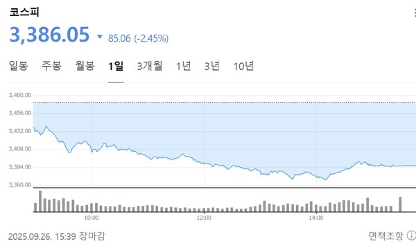 26일 전일 대비 0.89% 하락한 3,440.39로 시작해 하락세를 이어가던 코스피는 오전 11시쯤 3,400선 아래로 추락했다. 코스피가 장중 3,400선이 무너진 건 지난 15일 이후 처음이다.
