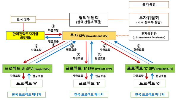 투자 사업은 미국 대통령이 미국 상무장관이 위원장인 투자위원회의 추천을 받아 선정하되, 투자위원회는 사전에 한국의 산업통상부 장관이 위원장으로 있는 협의위원회와 협의해 상업적으로 합리적(commercially reasonable)인 투자만을 미국 대통령에게 추천한다.
